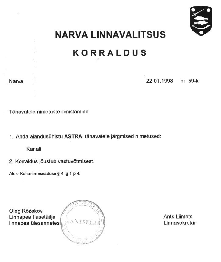 - Kanali tänav 22.01.1998 korraldus 59-k
