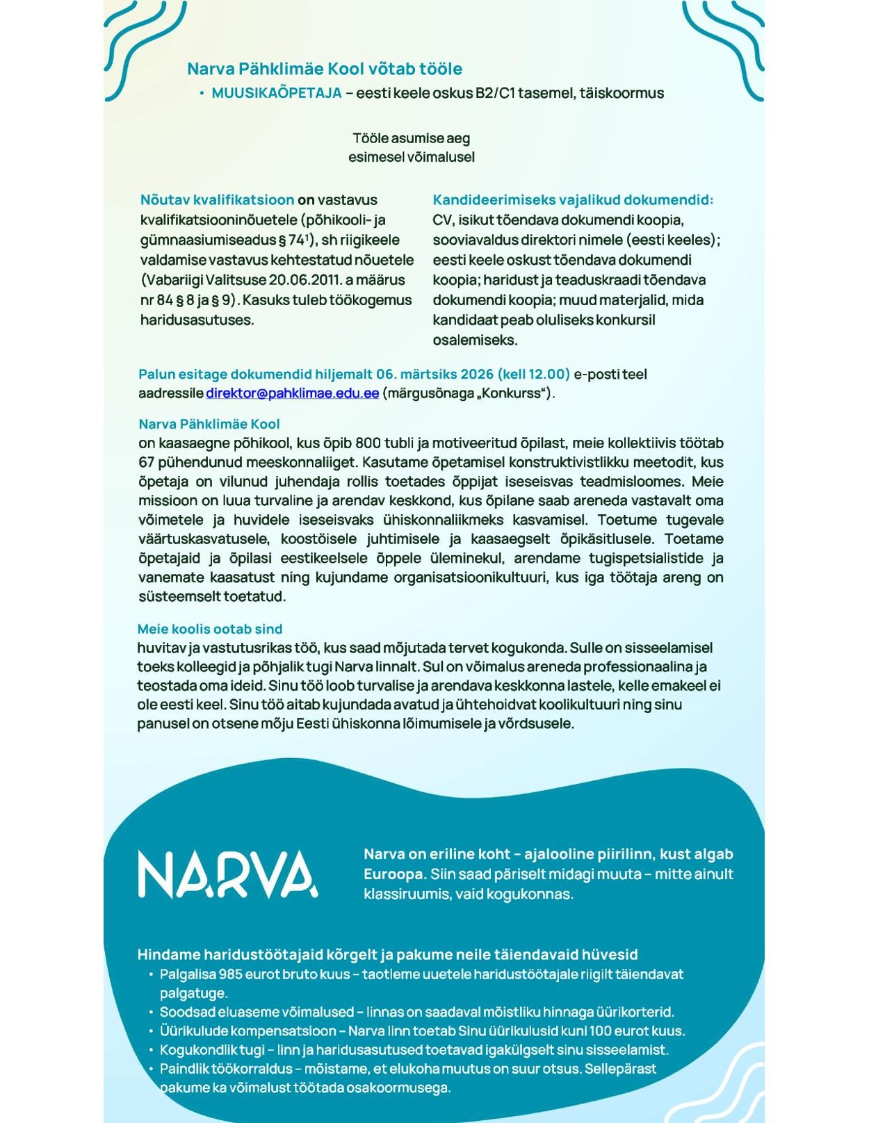 Narva Pähklimäe Kooli tööpakkumine