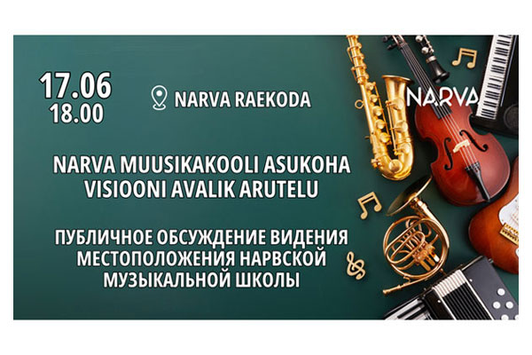 Приглашаем вас на публичное обсуждение видения местоположения Нарвской музыкальной школы, которое состоится во вторник, 17 июня, с 18:00 до 19:30 в зале на втором этаже Ратуши Нарвы.