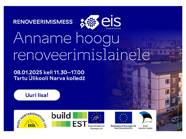 Ettevõtluse ja Innovatsiooni Sihtasutus (EIS) koostöös Eesti Korteriühistute Liiduga (EKÜL) kutsub renoveerimismessile. Mess toimub 8. jaanuaril kell 11.30–17.00 Tartu Ülikooli Narva kolledžis (Raekoja plats 2).