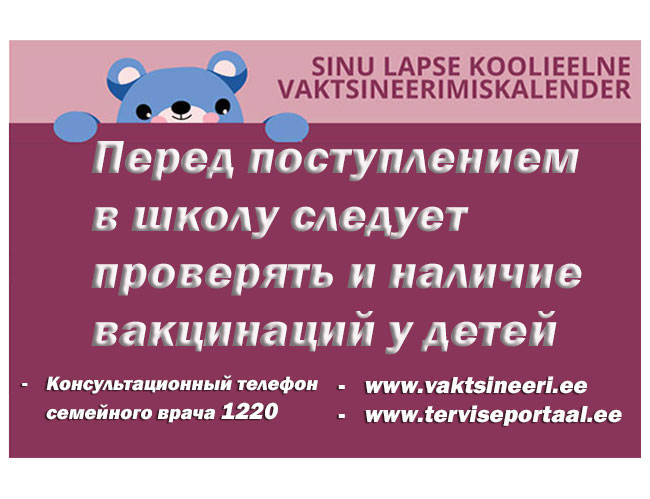 "Вакцинация является очень эффективным и безопасным способом защиты ребенка от болезней, которые могут быстро распространяться и приводить к серьезным осложнениям. Начало школы – подходящее время, чтобы кроме наличия необходимых школьных принадлежностей проверить и статус прививок ребенка», — сказала Ханна Яэ, руководитель службы вакцинации Кассы здоровья. «Перед тем как пойти в первый класс, помимо предшкольного медицинского осмотра, ребенок должен также сделать у семейного врача прививку, обеспечивающую защиту от дифтерии, столбняка, коклюша и полиомиелита. Кроме того, перед поступлением в школу ребенок должен был получить защитную прививку от кори, свинки и краснухи".